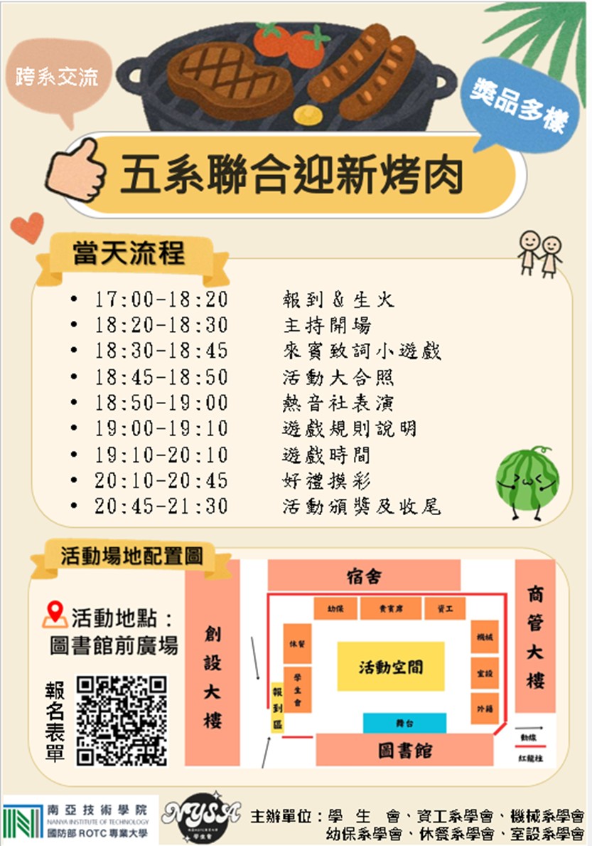 新學期怎麼能少了烤肉趴? 由學生會主辦、五系學會(資工系、機械系、幼保系、休餐系、室設系)協辦的「五系聯合迎新烤肉會」盛大登場! 這是一場結合美食饗宴、交友聯誼、趣味競賽、音樂表演與精彩摸彩的校園活動, 邀請全校師生一同參與,共度充滿香氣與笑聲的夜晚! 當日活動亮點 香氣十足的烤肉饗宴 — 現場炭火直烤,香氣四溢,邊吃邊聊天超放鬆! 熱音社表演嗨翻全場 — 現場樂團演出,氣氛滿滿! 自由歡唱 × 趣味遊戲 — 展現自我、挑戰闖關,贏取獎金! 好禮摸彩活動 — 超豐富獎品等你拿!學生會提供藍芽投影機、拍立得相機(含底片)、電競鍵盤滑鼠組、隨身碟等大獎(抽獎資格:已繳學生會費學生)。 活動時間:114年10月22日(三)18:00–21:30 活動地點:南亞技術學院 圖書館前廣場(資圖大樓前) 報名方式:即日起至10月20日(一)止,掃描海報 QR Code 報名,或至創意設計大樓I108學生活動組辦公室報名。 參加對象:全校師生 不論你是剛入學的新鮮人,還是想重溫熱鬧氣氛的學長姐, 都別錯過這場充滿歡笑與香氣的夜晚! 讓我們一起在秋夜中相聚,烤出友情、烤出回憶!🔥 |